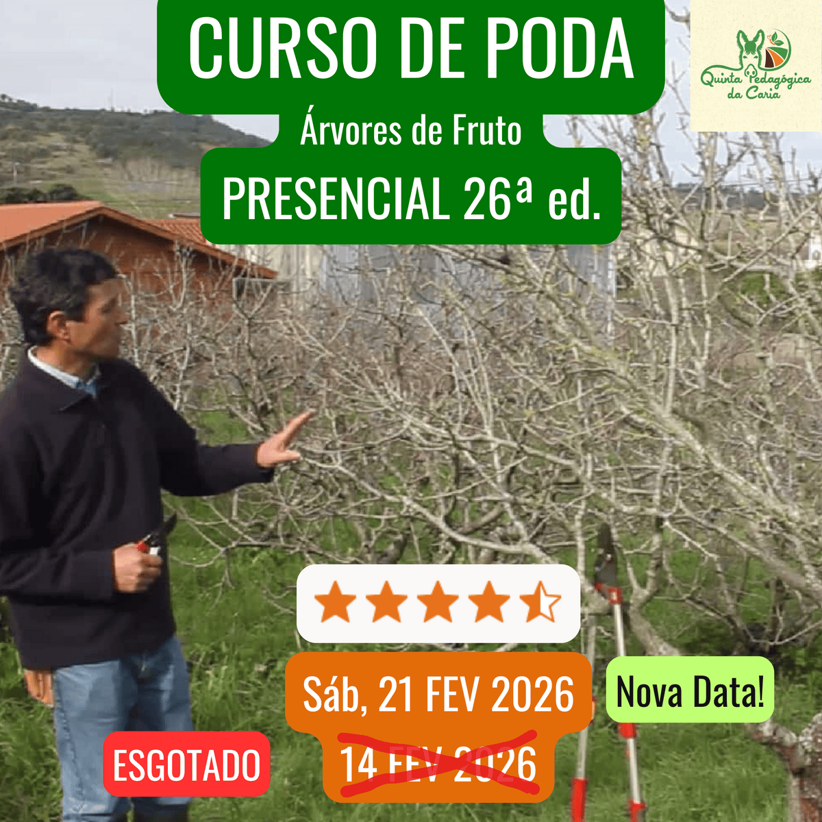 A entidade responsável pelo Curso de Poda Online é a Quinta Pedagógica da Caria. Pode entrar em contacto connosco através dos meios indicados no nosso site https://www.quintadacaria.com
